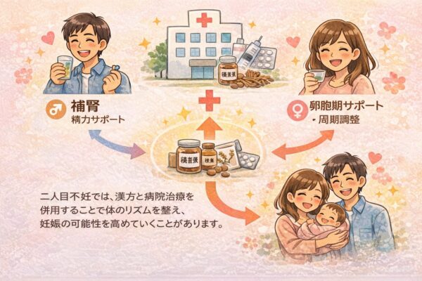 二人目不妊では、漢方と病院治療を併用することで体のリズムを整え、妊娠の可能性を高めていくことがあります。