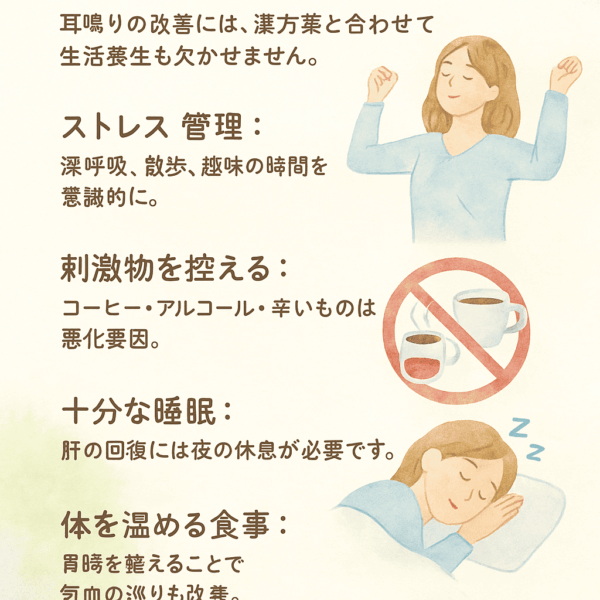 耳鳴りの改善には、漢方薬と合わせて生活養生も欠かせません。